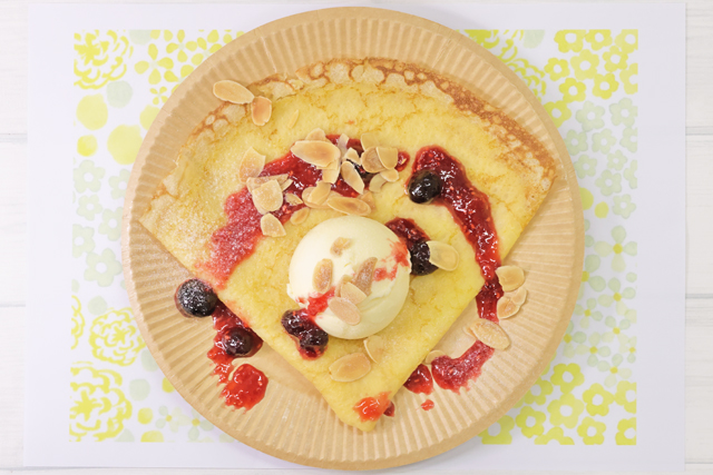 カフェは「紅茶と桃のヴェリーヌ」「クレープ ベリーソース添え」「チョコブラウニー」の3種(ドリンク付き)。