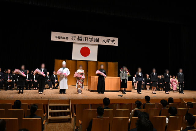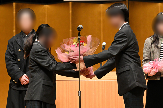 毎年恒例の花束贈呈では、在校生代表から新入生代表へ歓迎の想いを込めた花束が手渡されます。