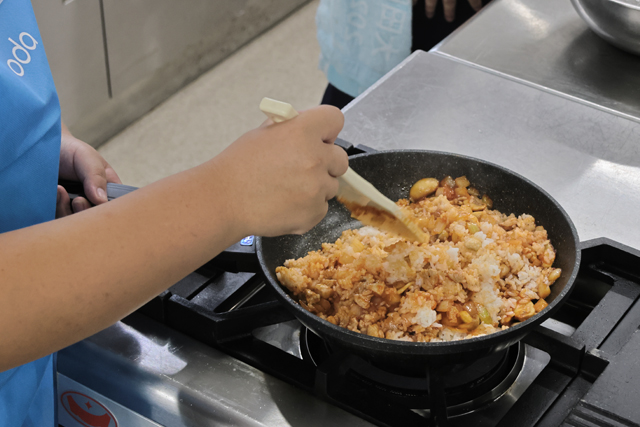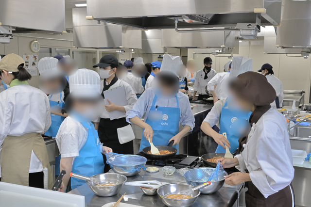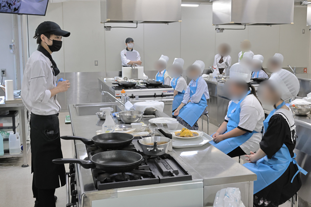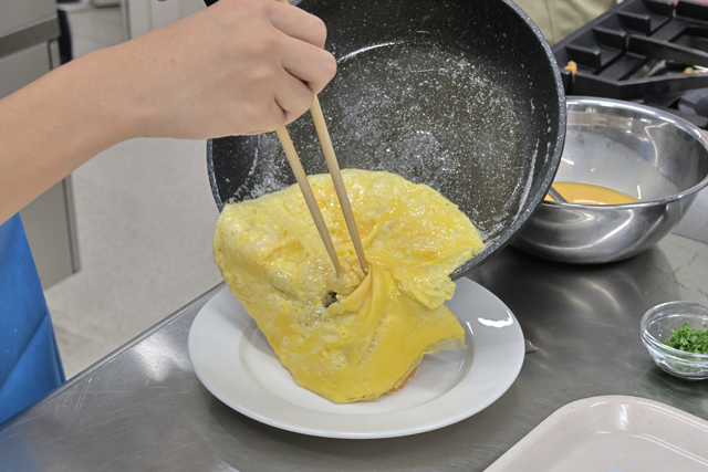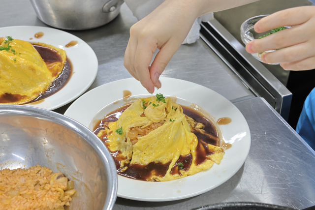 本日は、当校の体験入学メニューで1、2を争う人気の“ひとひねり”したオムライス作りを再度実施しました。