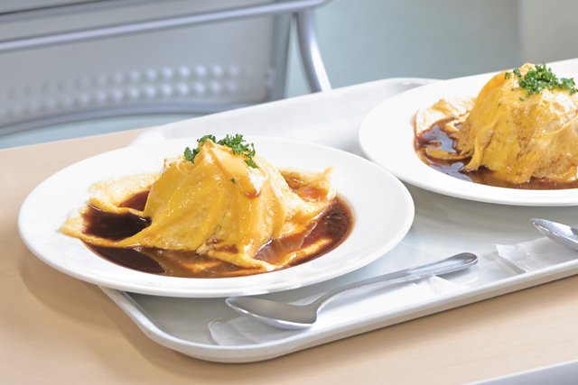焼いた卵のドレープが作り出す起伏と赤ワインソースが美しく味わい深いオムライスです。