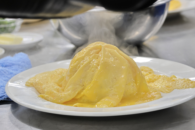 3.溶いた卵を焼きながらひねり、チキンライスの上に載せてソースをかける。 ……以上です!