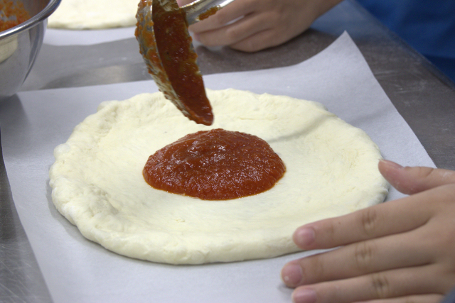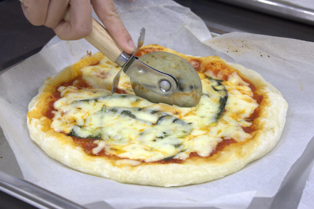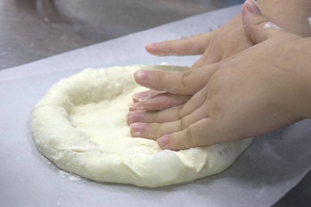 生地の伸ばし方には、めん棒を使う方法と手で広げる方法がありますが、今回の参加者の多くは手で伸ばして、きれいな丸型に仕上げていました。
