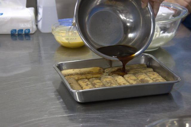 濃いめに淹れたエスプレッソにフィンガービスケットを浸し、バットに並べていきます。