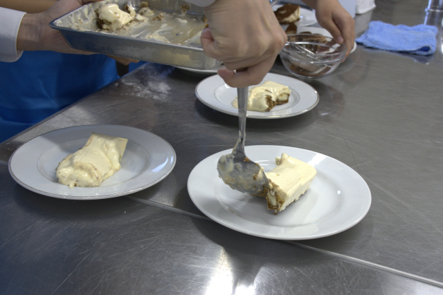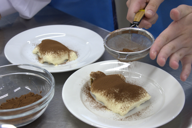 ピザが焼き上がるのを待つ間に、ティラミスの仕上げです。冷やし固まったティラミスをスプーンで取り分け、器に盛り付けたら、茶こしでココアパウダーをふりかけて完成。